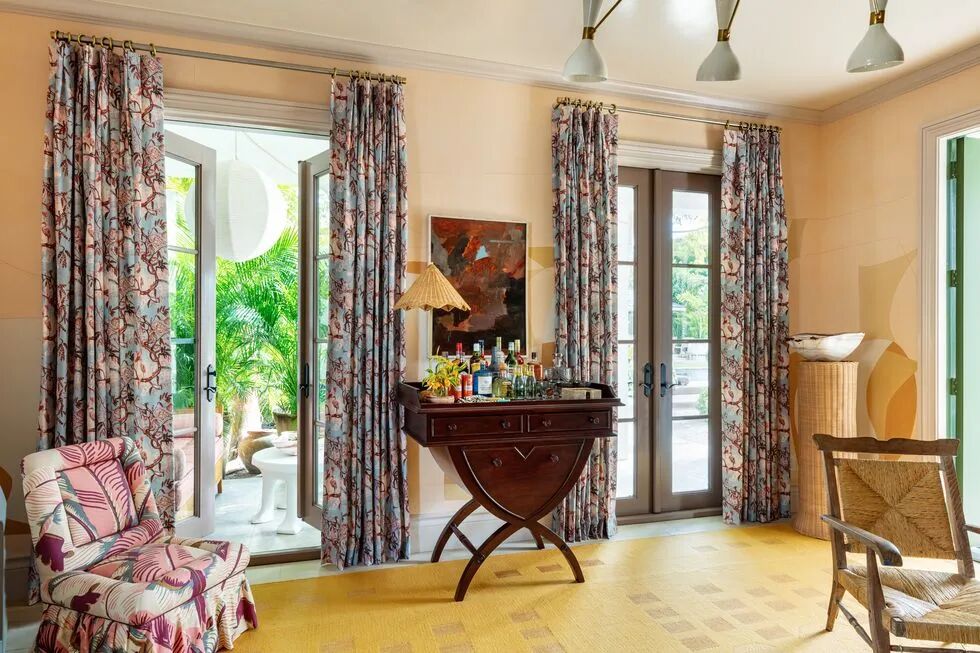 在这个泳池边的休息室里,设计师给两扇法式门穿上了反褶裥窗帘,上面印着Ferrick Mason的图案,搭配着热带植物和动物,与外面佛罗里达树叶相呼应。墙纸和装饰画都充满着印象主义风格,某些家具也是,窗帘之间一个深木色的酒吧桌暗示着休闲自在的享乐时光,发散的灯具仿佛这里是一个演播室。