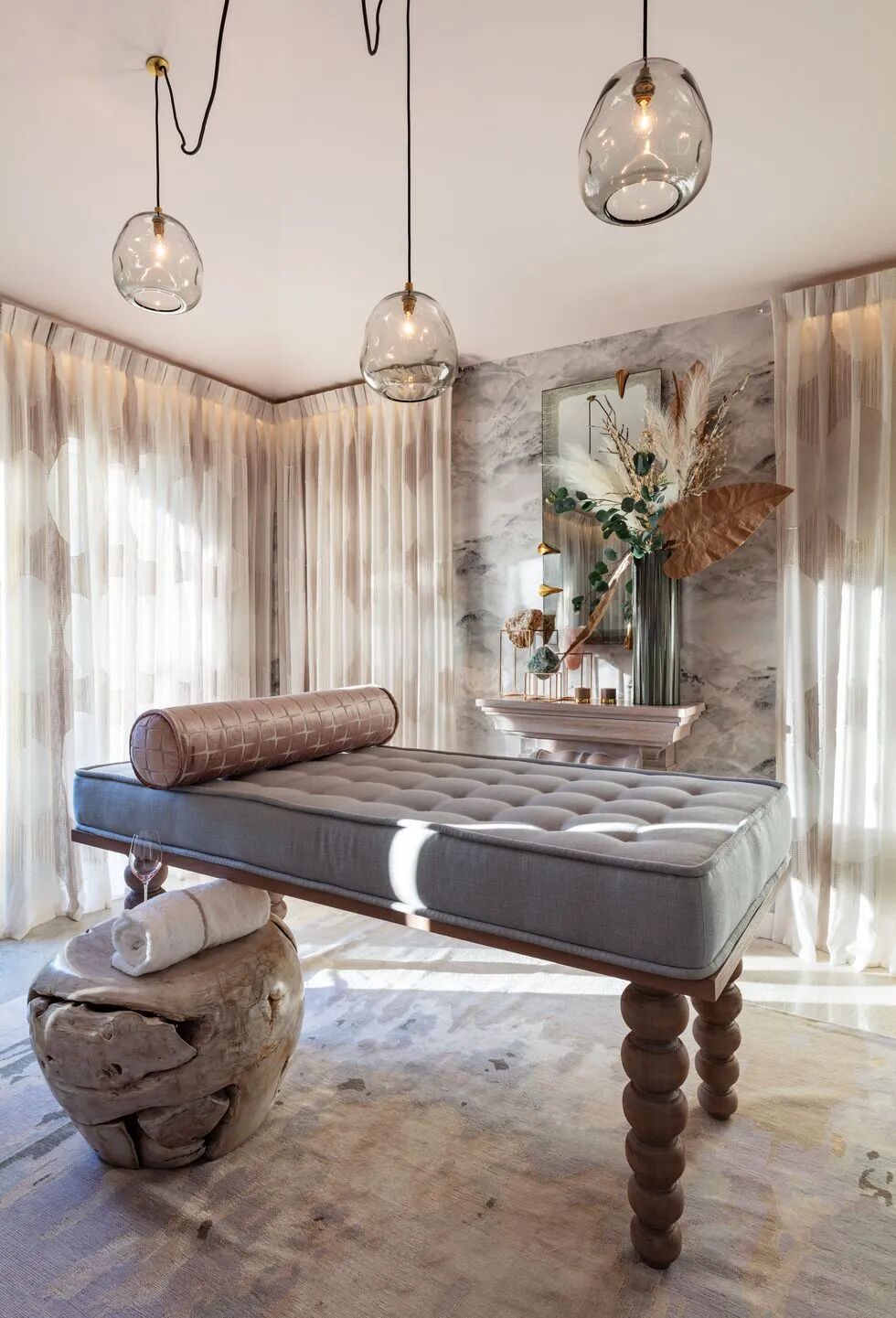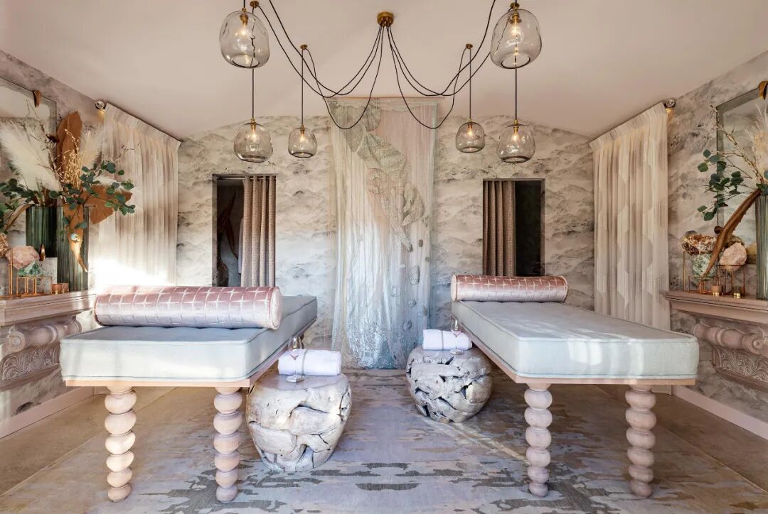 倒角褶皱,轨道安装的窗帘装饰的角落将这个水疗空间包裹在豪华柔软的氛围中。来自Zoffany的透明的亚麻布柔和地调节了自然光,并营造出一种禅宗般的绿洲感。