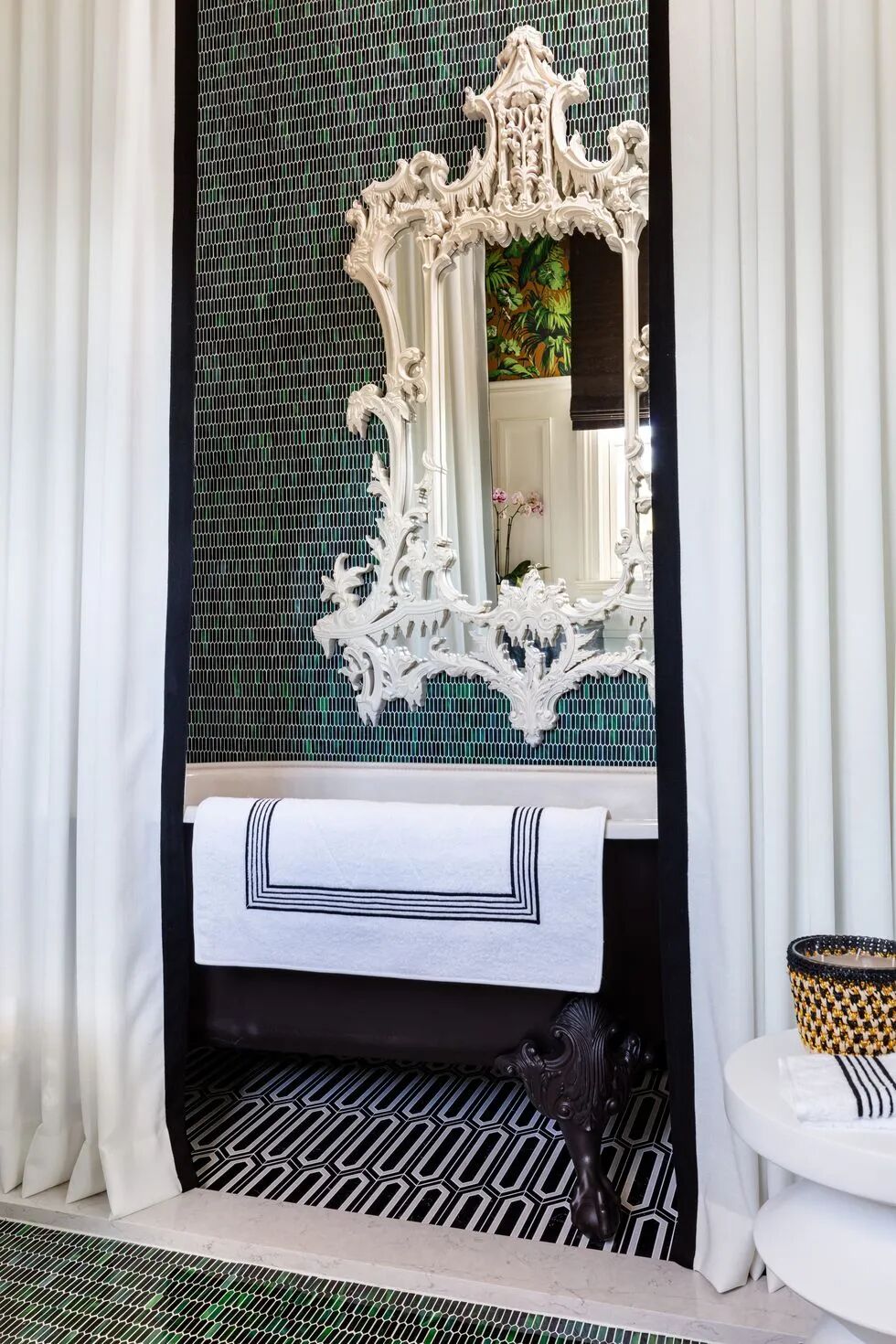 与上面的浴缸配套,茉莉花般的梳妆台让这个浴室空间焕然一新,厚实而有冲击力的绿色天鹅绒饰边唤醒了黑白的梳妆台裙,量身定制的摩卡色罗马帘提供了私密性,同时仍允许自然光通过。