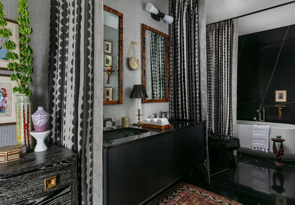 由科勒(Kohler)设计的这款爪足浴缸使用一对布帘(而不是单个浴帘)完成其入门欢迎仪式,为这间时尚的宾客浴室增添了舒适感。