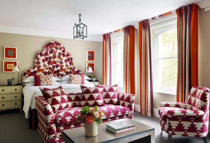 图案和双色组合会营造出富丽绚烂的室内景象。条纹和几何图形会让原本单调的酒店装饰变得新潮起来,不规则花纹会打破这种平静感,尤其在花蕾红和爱马仕橙营造的氛围之下。一起来看看这些催生蓬勃生命力的鲜艳配色吧!它们能让你的思维开阔,变得大不一样。