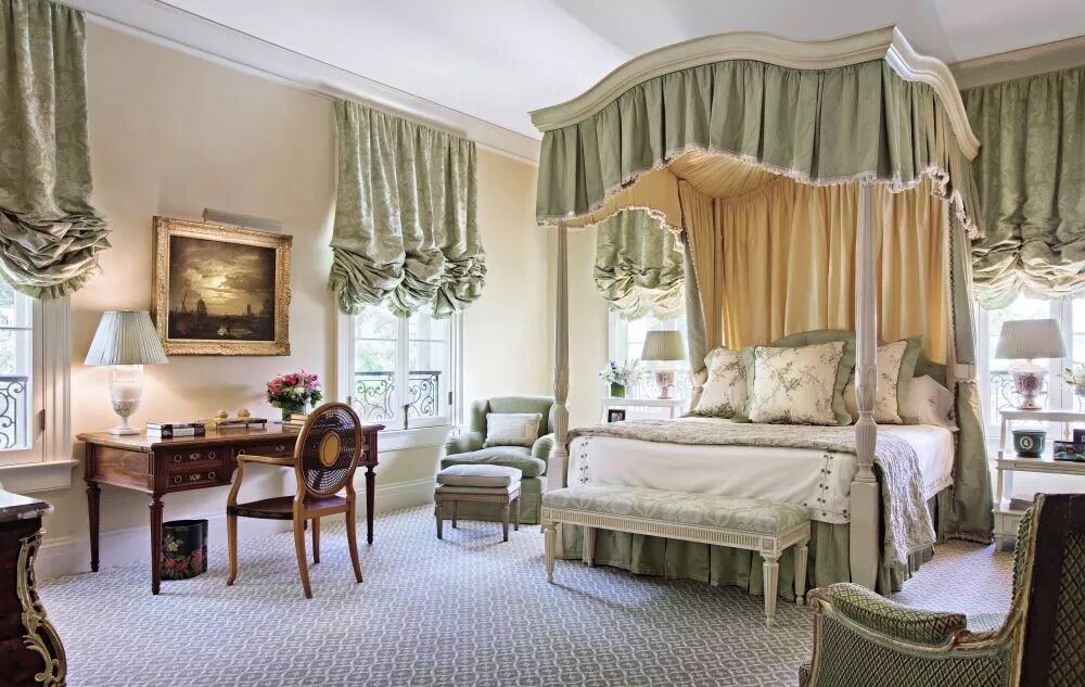 同样地,米色+灰绿色的搭配方式依然带来幽雅、舒缓的惬意感受。不论是灰绿色壁纸,还是灰绿色帘幔,皆会让人发自内心的宁静。
