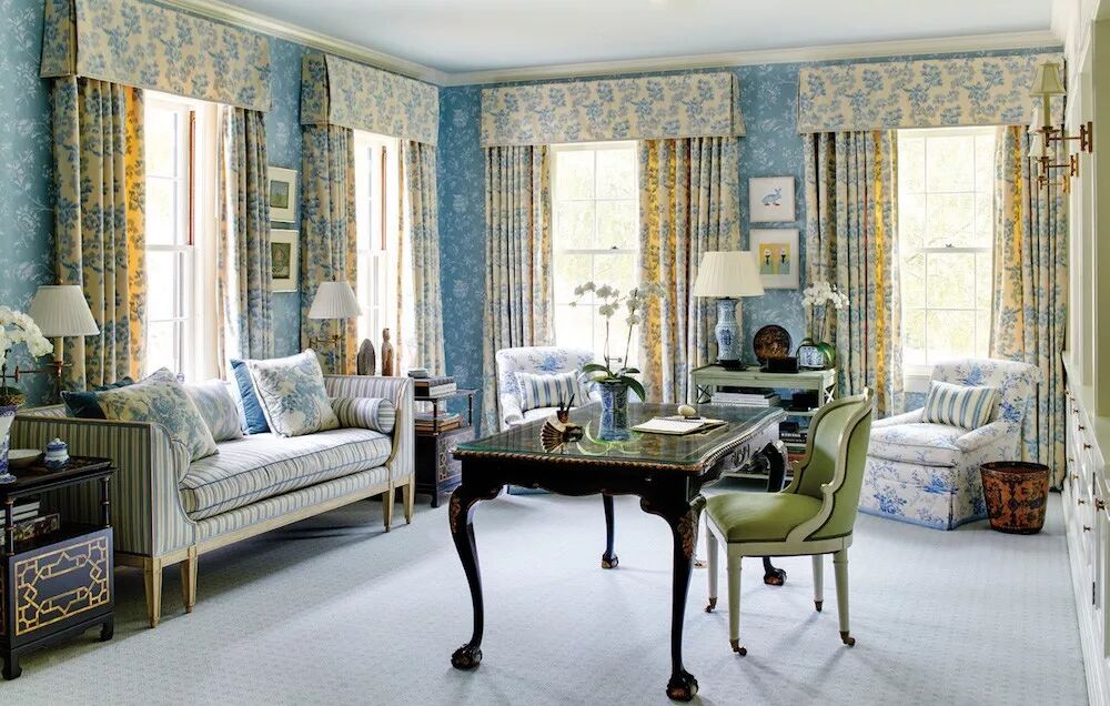 而在蓝色调环境下,米色系印花窗帘也能迎合唯美的室内光线流露出一点浪漫古雅的味道。