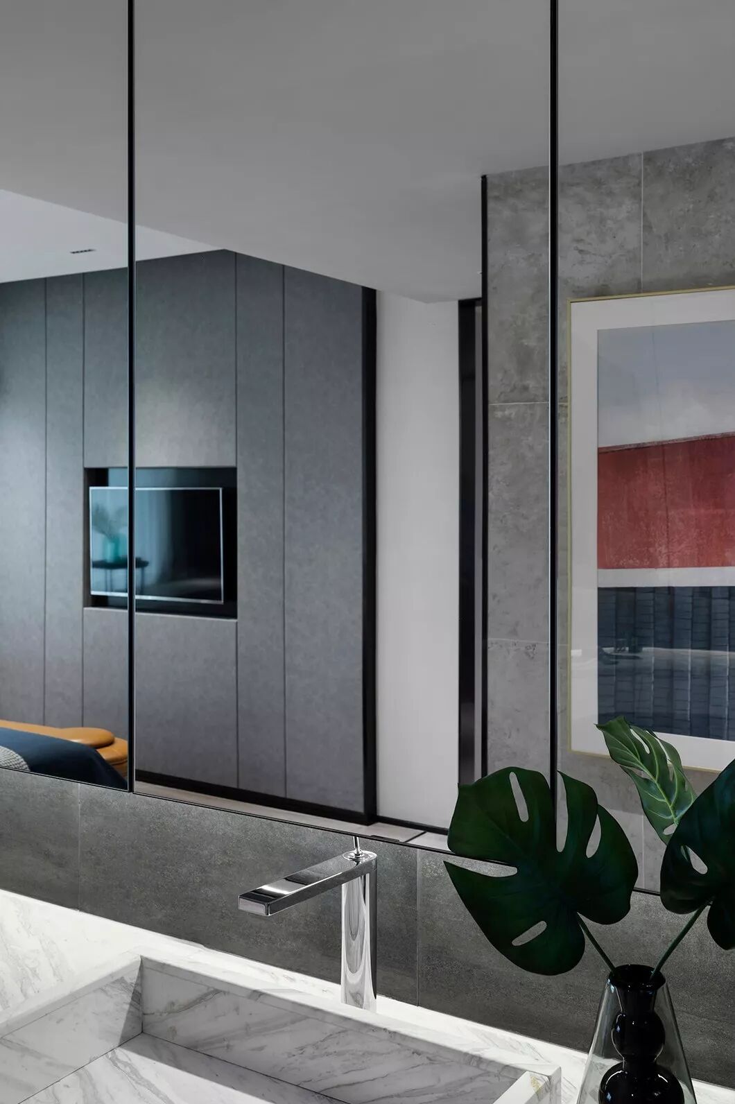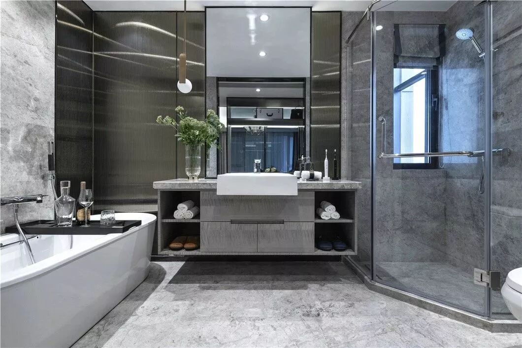 卫生间延续了灰色调的简约基调 达到以简胜繁的效果 超长台盆区与化妆区 嵌入式浴缸接飘窗设计