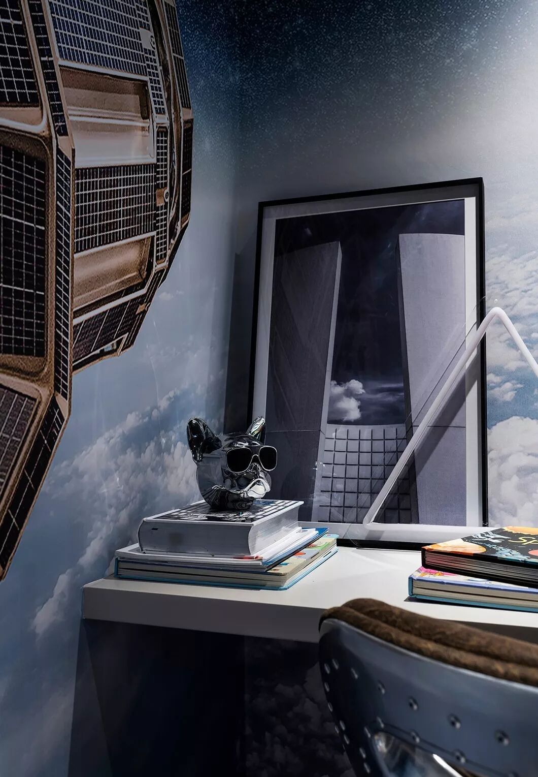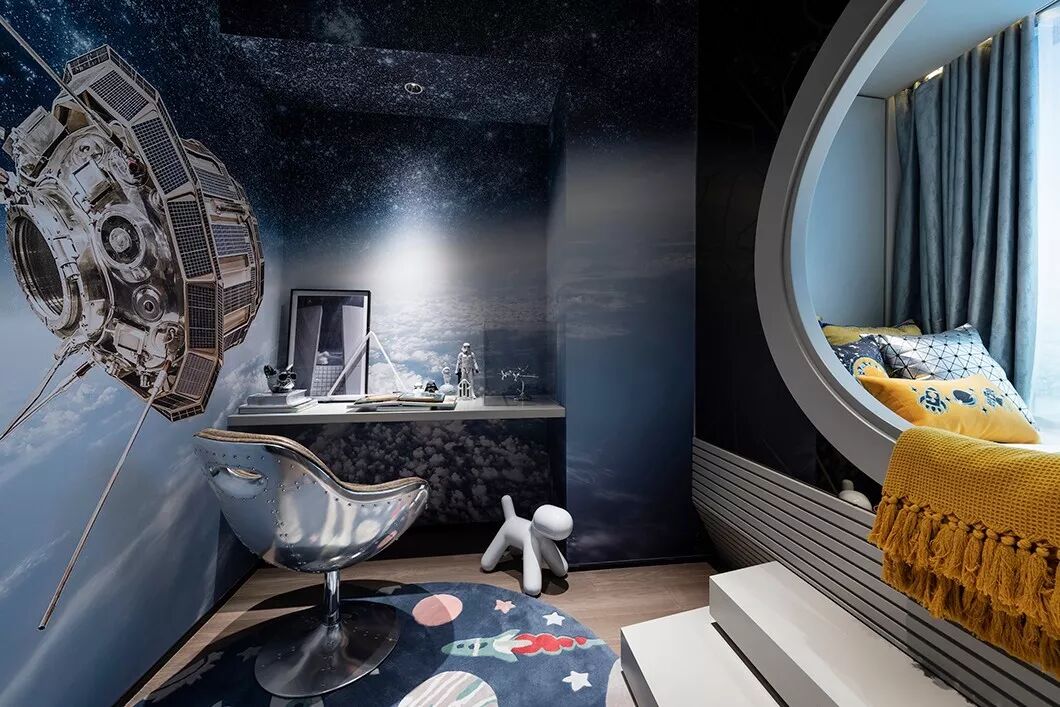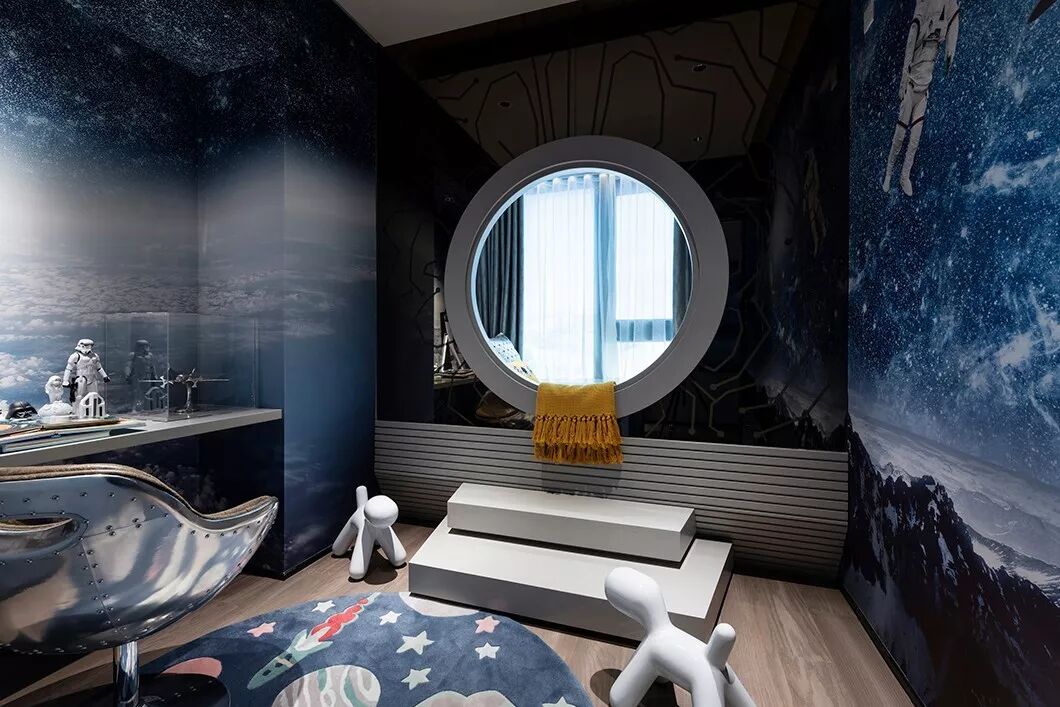 儿童房以航空为主题 搭配地毯形成深蓝色氛围 而床品则使用黄色 与房间形成对比