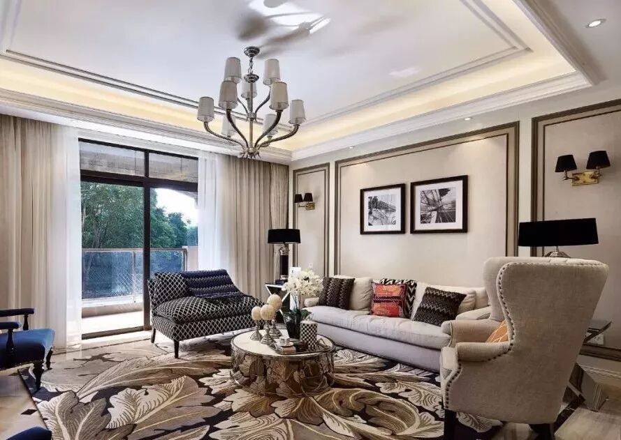 美式风格的客厅窗帘,可以选择带有花纹的窗帘,效果很是优雅大气。