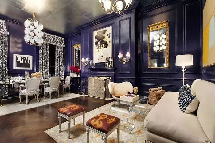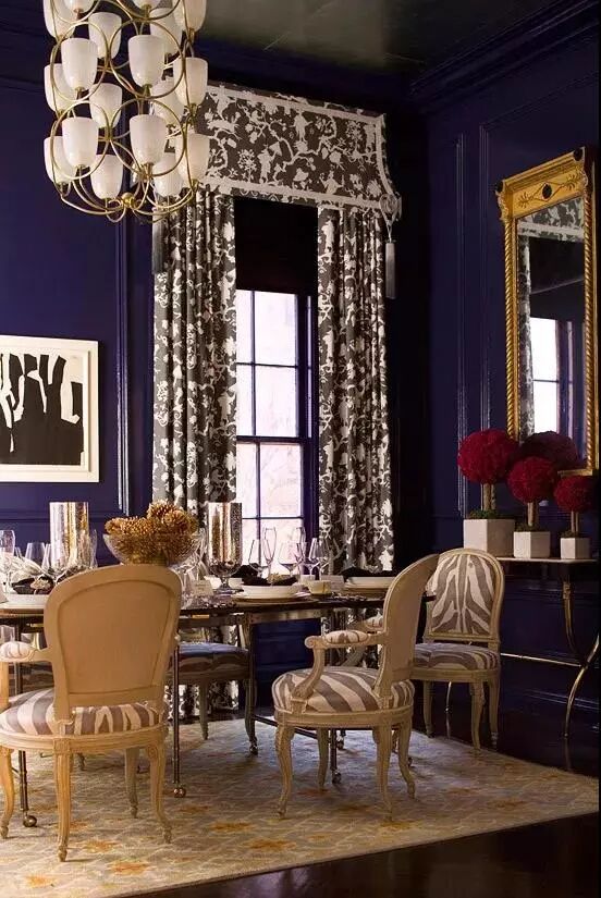 在以海军蓝装饰墙面背景的客厅+餐厅的开放式都市格调的空间设计中,悬挂黑底白色法式中国风经典人物风景图案的印花窗帘及窗幔,鲜明的色彩碰撞以及气质融合打造出奢雅精致的视感体验。迎合着动物纹印花包布洛可可式餐椅以及新古典装饰镜等内饰家居,东西方的华丽碰撞,将空间装饰的愈加奢美诱人。