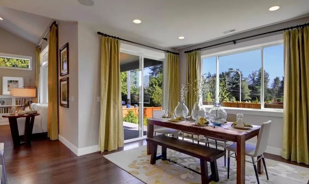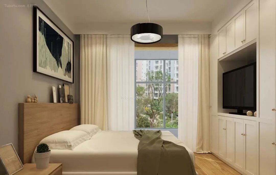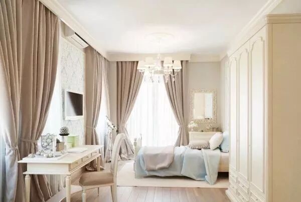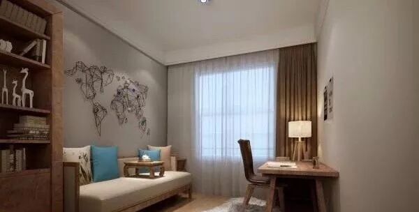 再次,应考虑窗帘的式样和尺寸。在式样方面,一般小房间的窗帘应以比较简洁的式样为好,以免使空间因为窗帘的繁杂而显得更为窄小。而对于大居室,则宜采用比较大方、气派、精致的式样。窗帘的宽度尺寸,一般以两侧比窗户各宽出10厘米左右为宜,底部应视窗帘式样而定,短式窗帘也应长于窗台底线20厘米左右为宜;落地窗帘,一般应距地面2~3厘米。
