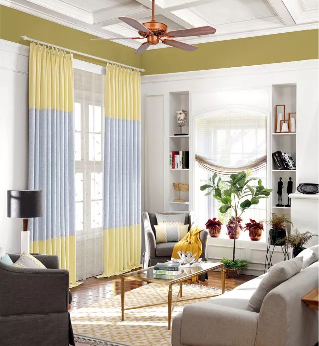 a、米黄色的墙布与白色的窗帘搭配,可以缓和明黄色的尖锐感,不经意间就勾勒出温馨浪漫的画面;浅蓝色的墙布与轻飘的白色窗帘搭配,每个瞬间都隐隐地透露着“小资”味道的生活情调。