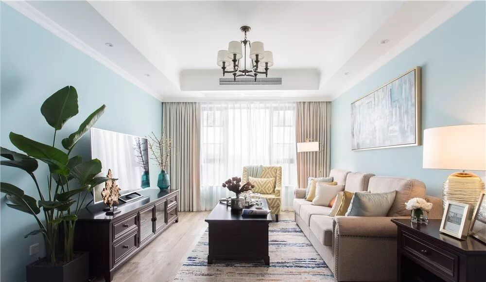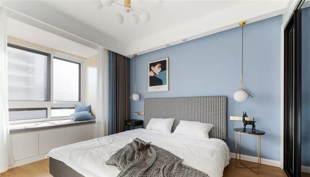根据空间风格配色,在窗帘上做一个呼应,两种颜色拼接遮光帘+白纱帘,更有层次感。