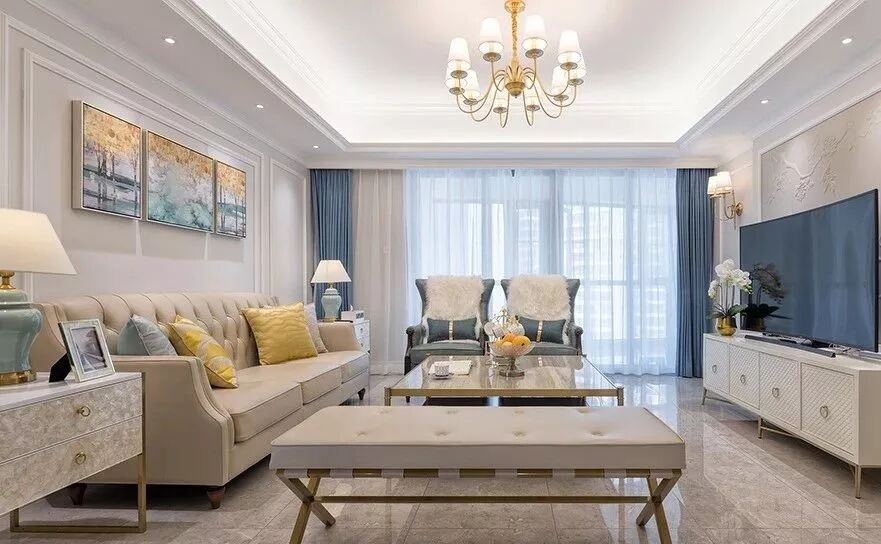 在客厅通常会选择落地形式,可以完全阻挡光源、保护隐私,同时视觉上还能拔高空间层高。