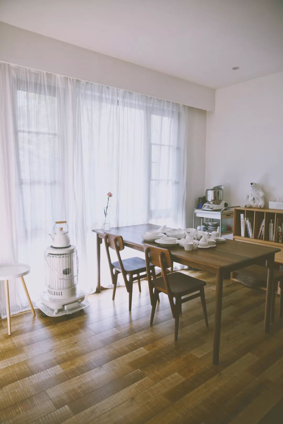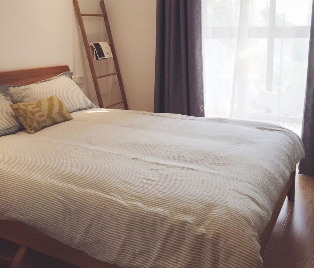 我们之前提及的屋主吞吞,在卧室就只安装了一层薄亚麻窗帘,她喜欢阳光照在窗帘上,竹影斑驳可见的感觉。(对,吞吞住的是三层别墅,外面有竹子)