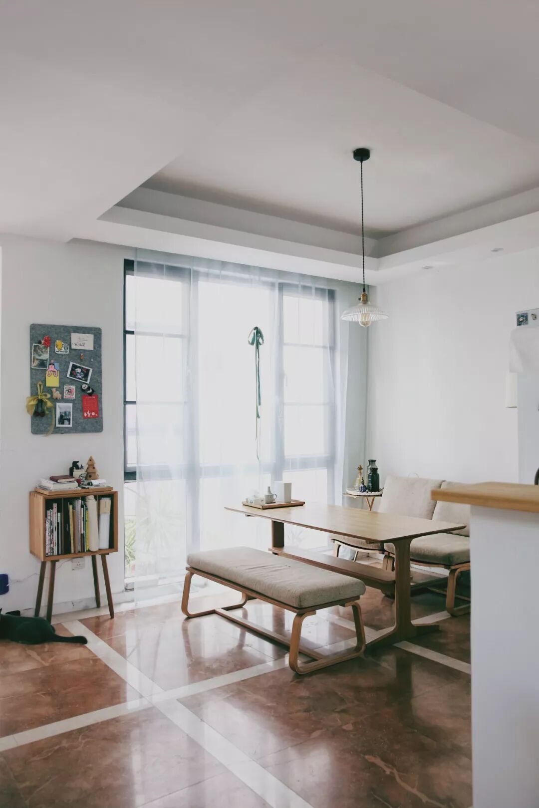 满满少女心的屋主小鱼,家里很多处都用了纱帘。小鱼将客厅和阳台打通,没有装推拉门,只用一层纱帘作为功能分区的隔断,且丝毫不影响室内隐私。
