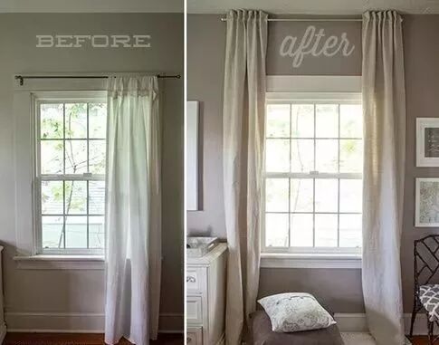 无论选择轨道还是罗马杆,我们都建议把窗帘杆抬高,从天花板一路垂到地板的长窗帘视觉上更美观,也会给人一种你家很高、很大气的错觉。