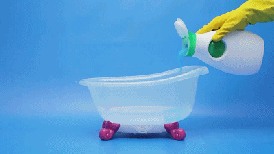 倒入适量清洁剂,放上修好的海绵来回擦拭