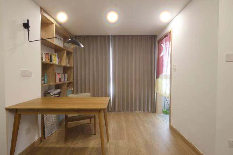 半墙式的窗帘,和窗户下的书桌相得益彰,即满足了房间里的收纳,学习工作的功能,还保持房间的私密性。