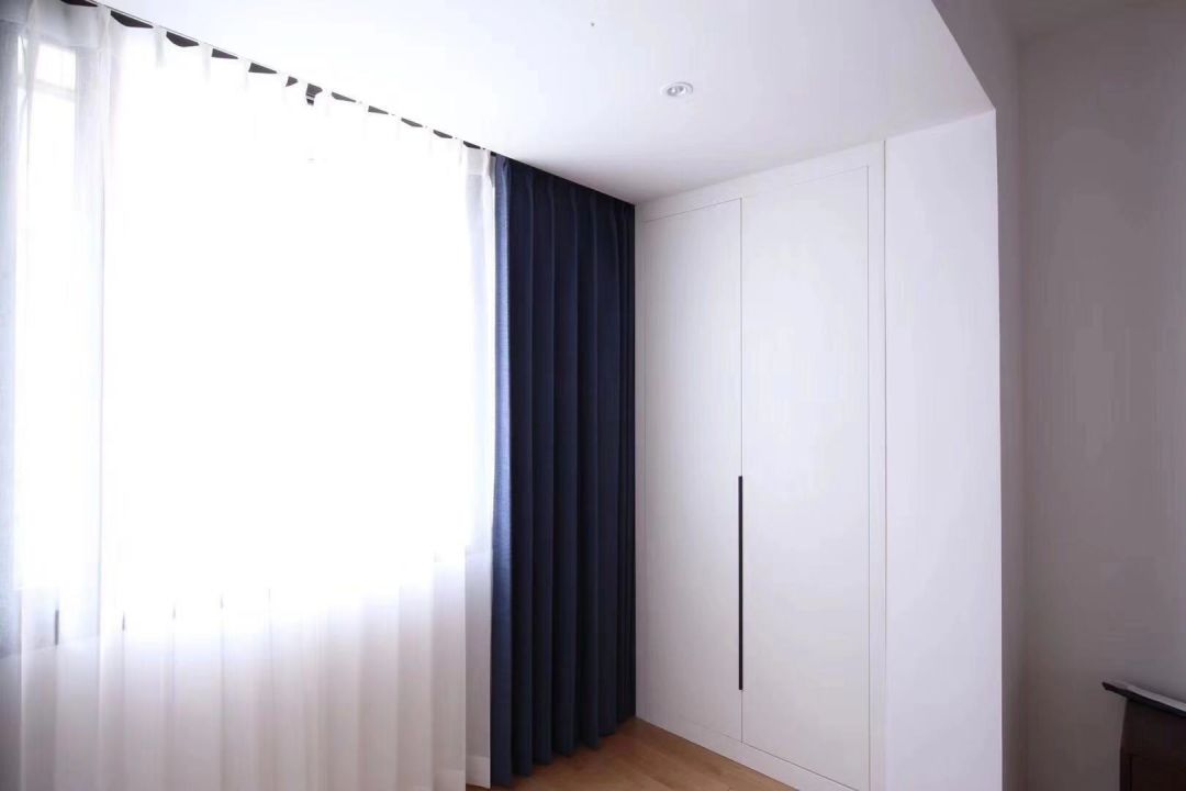 白色帘子,和整体浅色调的风格也很好搭配。窗帘最好长度可以长一点,视觉上也会拉长高度,让空间轻快明亮。