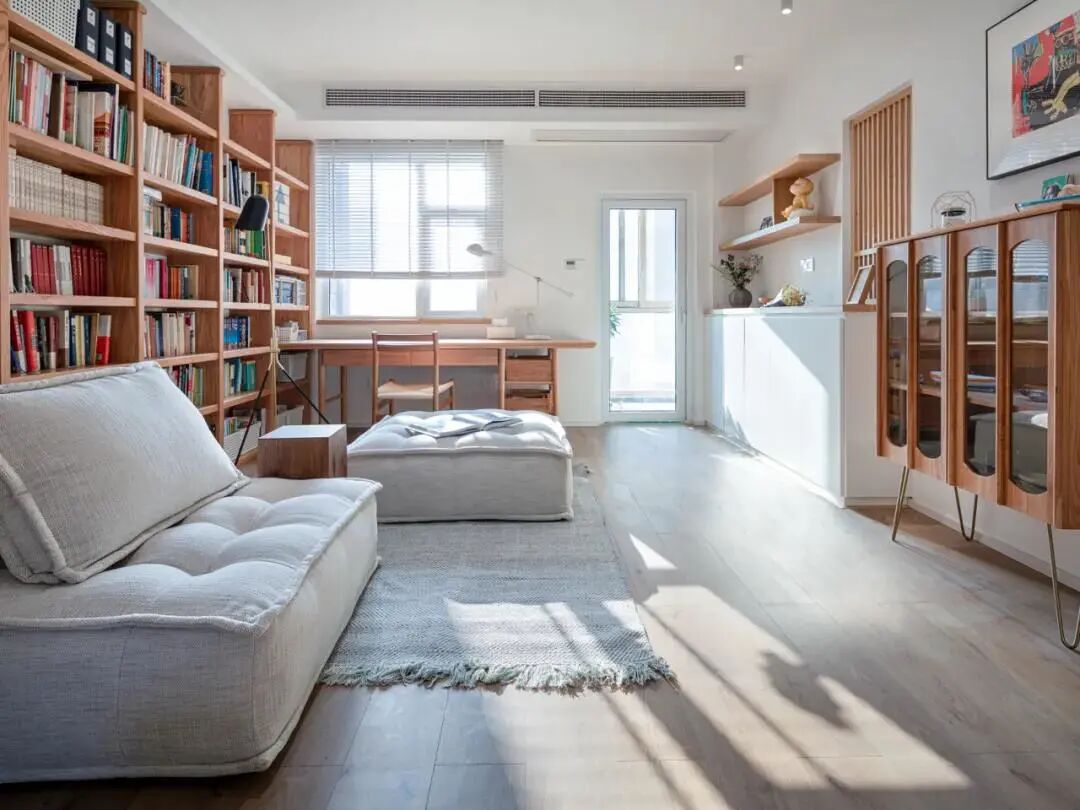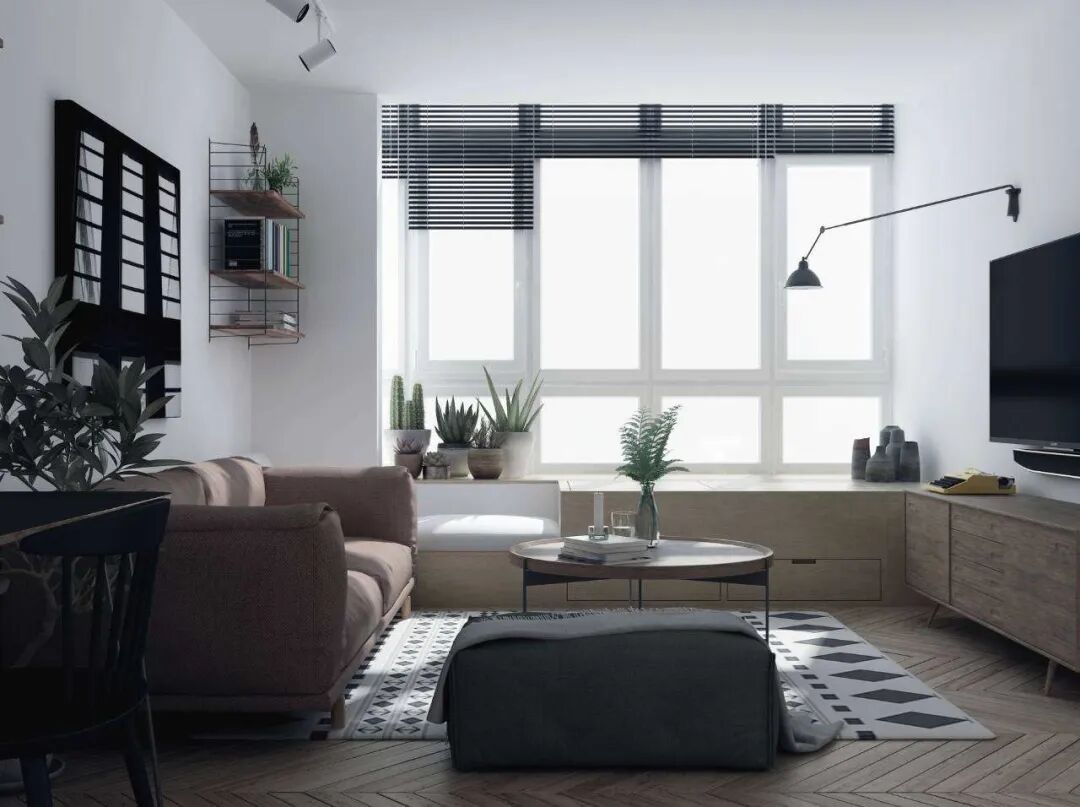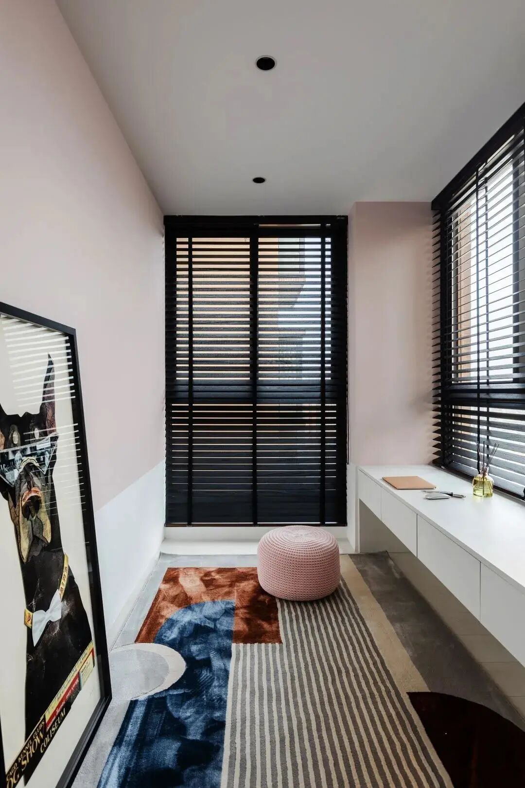 有飘窗或储物地台的客厅,百叶帘可以减少对空间的占用,增加通透感和高级感,光与影互相交织,自带浪漫与优雅。