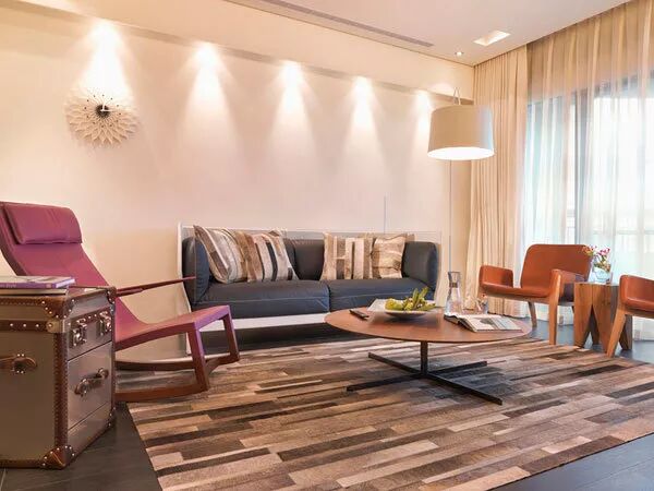 客厅是整个家居环境的体现,主要承担着会客和娱乐休闲的功能。如果经常在客厅里看电视,那么客厅的光线就不应该太强,建议选择具有挡光、隔热功能的厚棉麻或涤纶材质的窗帘。