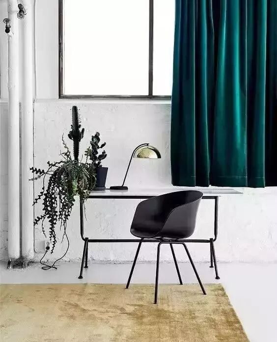墨绿的丝绒窗帘,让本来整体偏冷的房间多了一丝浓重的色彩,也显得更加温暖了。这样的情况千万不要用白色的窗帘,会让人感觉很冷。