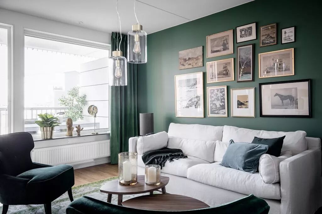 在这间客厅中,墨绿色主导了空间,这种森林色调尤其适合夏天,但白色中和了这段冒险,让空间整体感觉随和、内敛。