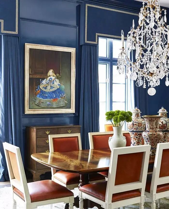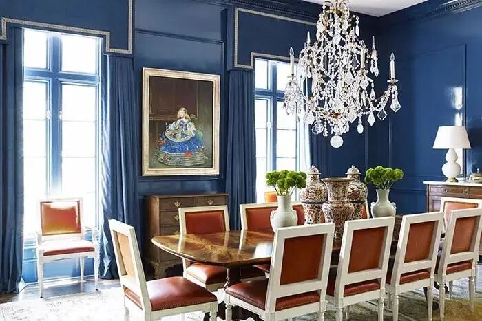 经典蓝深邃而饱满的色调在餐厅墙面中大面积呈现时,强劲的视觉吸力打造出别具一格的奢雅诱惑。搭配水晶吊灯和皮革餐椅,极具奢华质感的元素聚集为居室赋予了无与伦比的精致韵味。