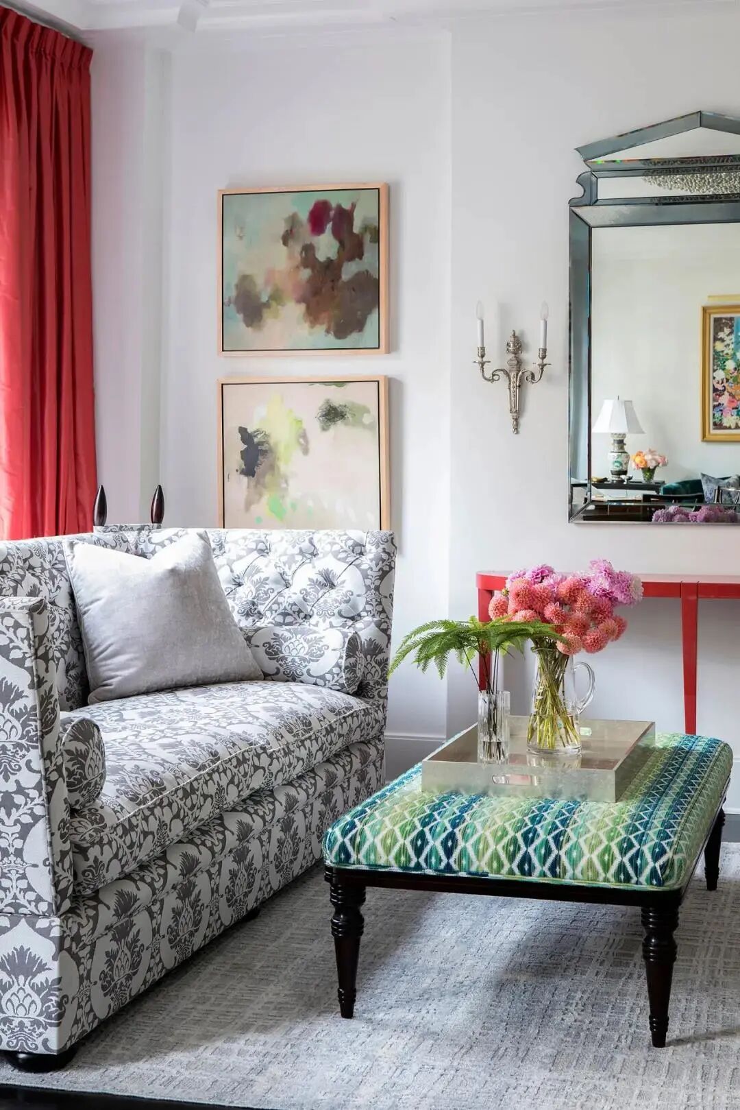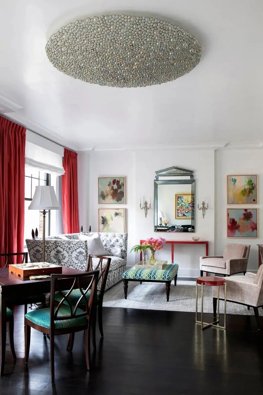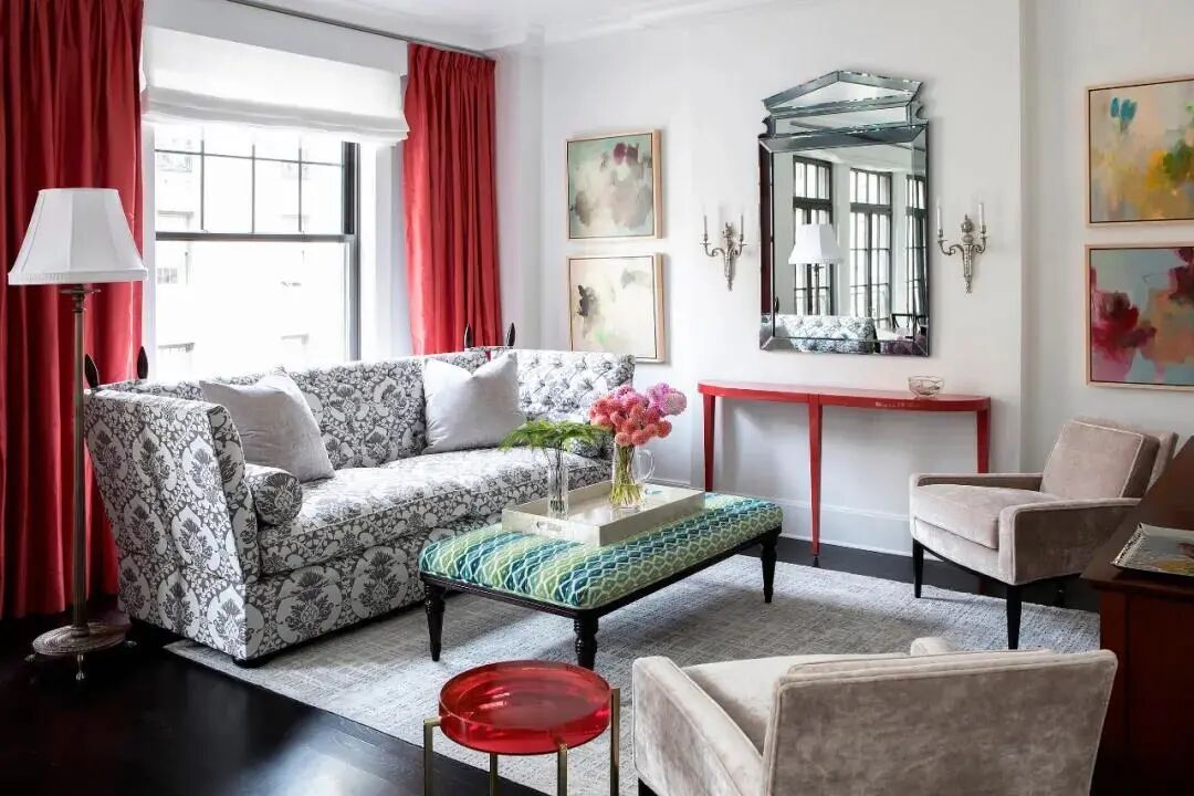 极光红色的窗帘为空间注入了热情明媚的气息,鲨鱼灰印花长沙发倚靠着窗口的和风与阳光,搭配草绿色的花纹软垫茶几,彰显出精致的田园氛围。一个极光红的弧形桌靠着墙面摆放,与烛灯包围的镜子互相映衬,显出一种现代派的精细与纤巧。