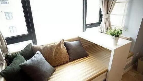 四、在飘窗上铺上木板,然后做成像卡座一样的沙发,再做一个小桌子,简单实用。