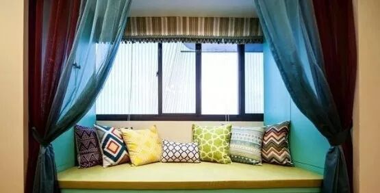 做法很简单:做一个和窗台高度相当的矮柜,高度45公分,深度50公分左右,营造出一个下窗台的感觉,在窗户两边放置一些家具,基本上就打造成了飘窗的样子。