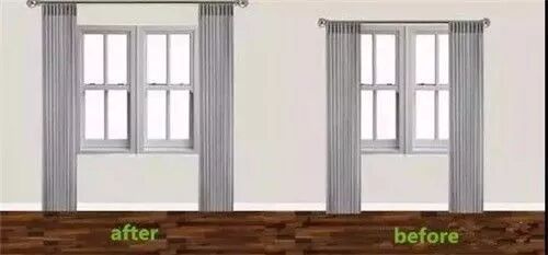 窗帘的悬挂高度:不要瞎节约那几寸布,窗帘挂高几厘米就能让层高显高几厘米,就像穿大长裙能显高是一个道理,从高于窗框上沿的13~18cm处开始悬挂效果较佳。