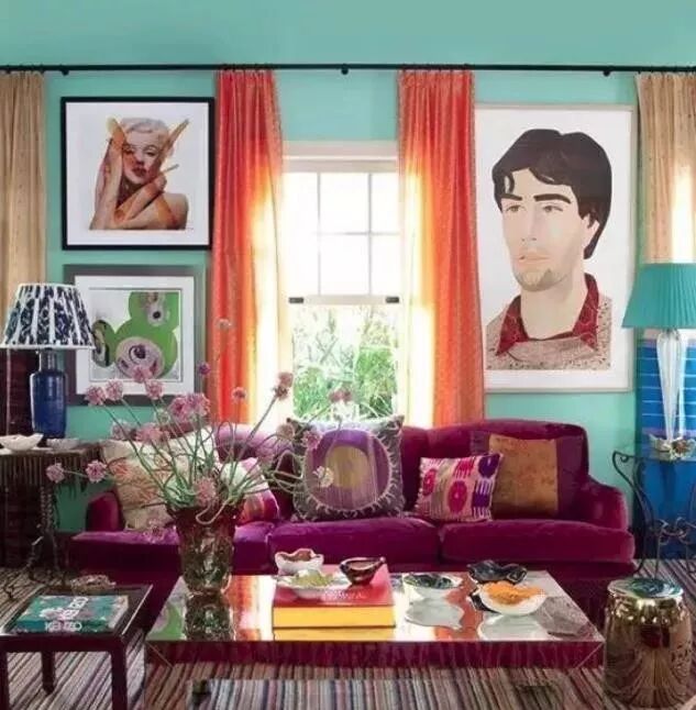很多年轻人喜欢不拘一格的撞色,如玫红色的沙发,搭配橘色的窗帘,再配上薄荷蓝的墙面,这些高饱和度的颜色搭配在一起,营造出充满艺术感的波普风。