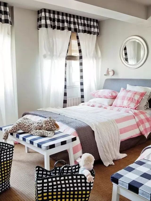窗帘边缘格子状也是为了配合卧室的风格。