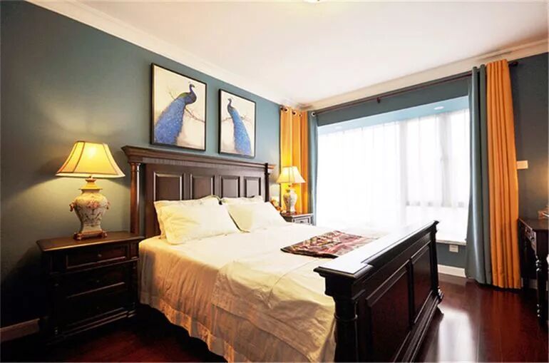 以白色、蓝色为主色调的空间十分小清新。深蓝色+暖黄色的撞色窗帘让偏冷色调的空间有了暖色的加入,而不显清冷。