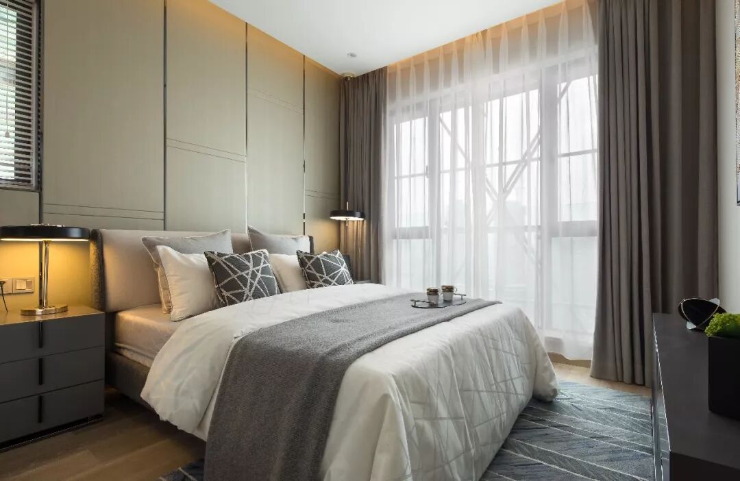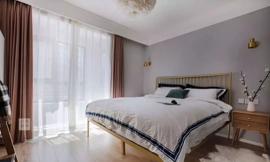 卧室的窗帘更注重功能性,要充分避光以保证睡眠。卧室内窗帘最好选择落地款,以免窗帘过短而漏光。