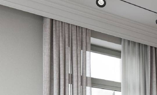 ▼ 轨道因为外形比较工业,配件琐碎,因此安装轨道的位置最好预置窗帘盒。窗帘盒可以是吊顶留槽,可以是木质挡板,或者做软包窗帘盒。