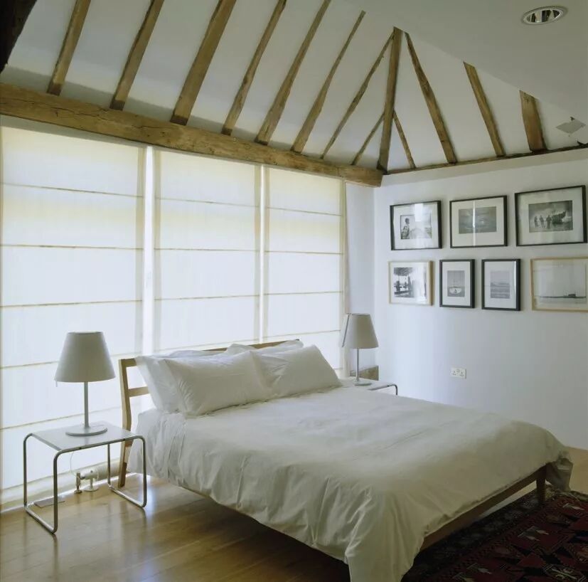阁楼一般都是斜顶的,所以可以用电动窗帘遮阳,既方便又美观,阳光透过天窗照下来,周末小憩超惬意。
