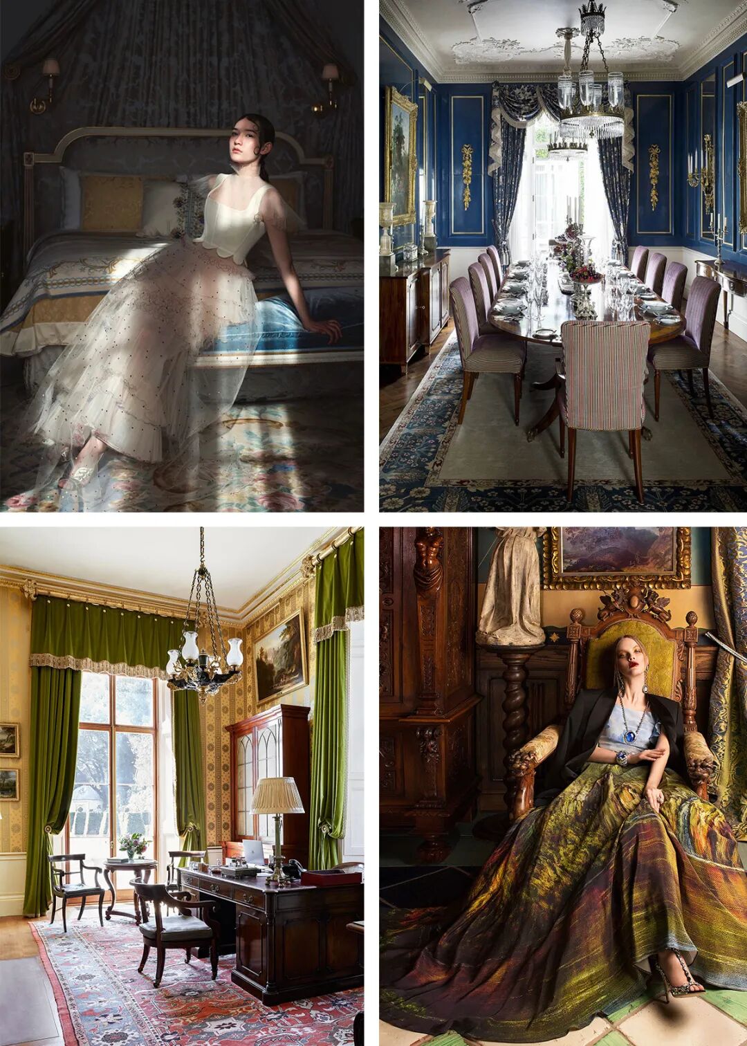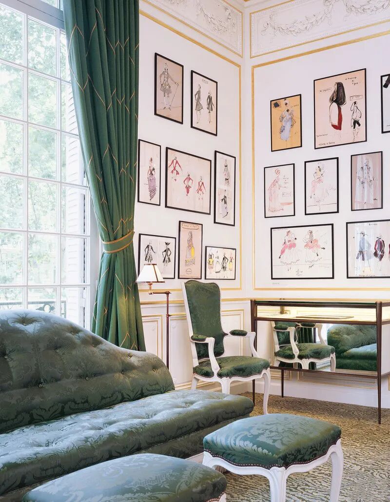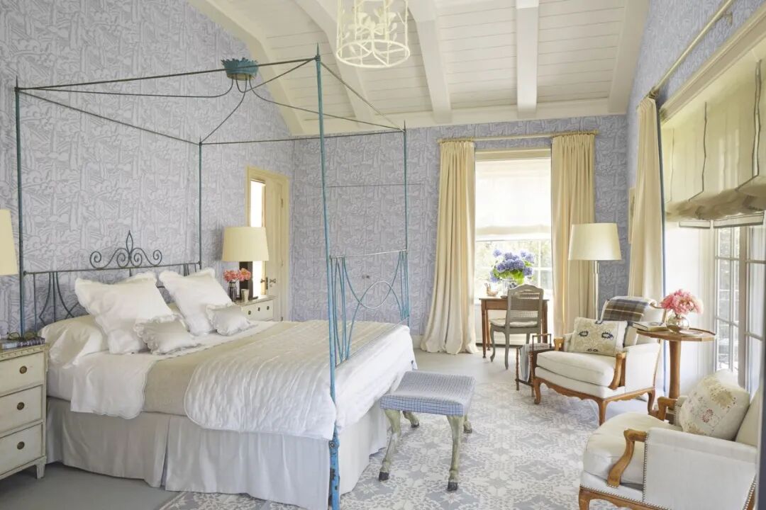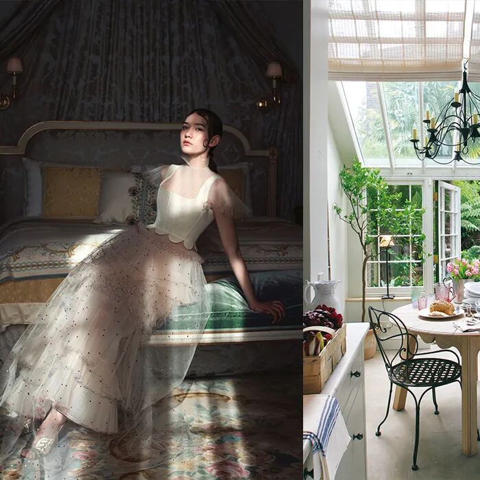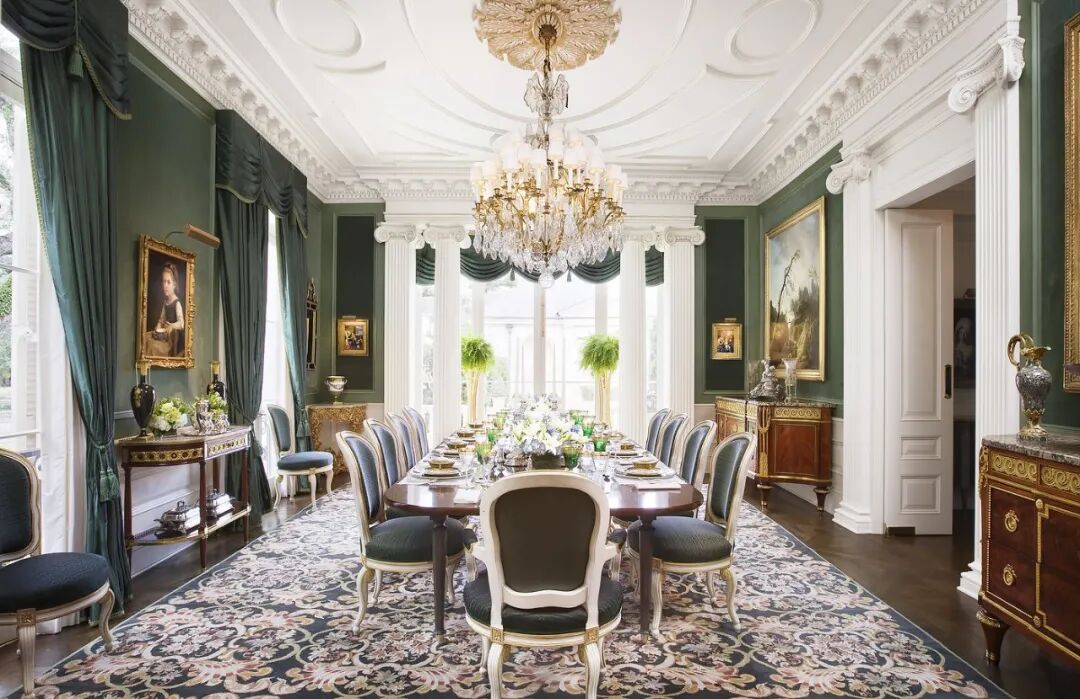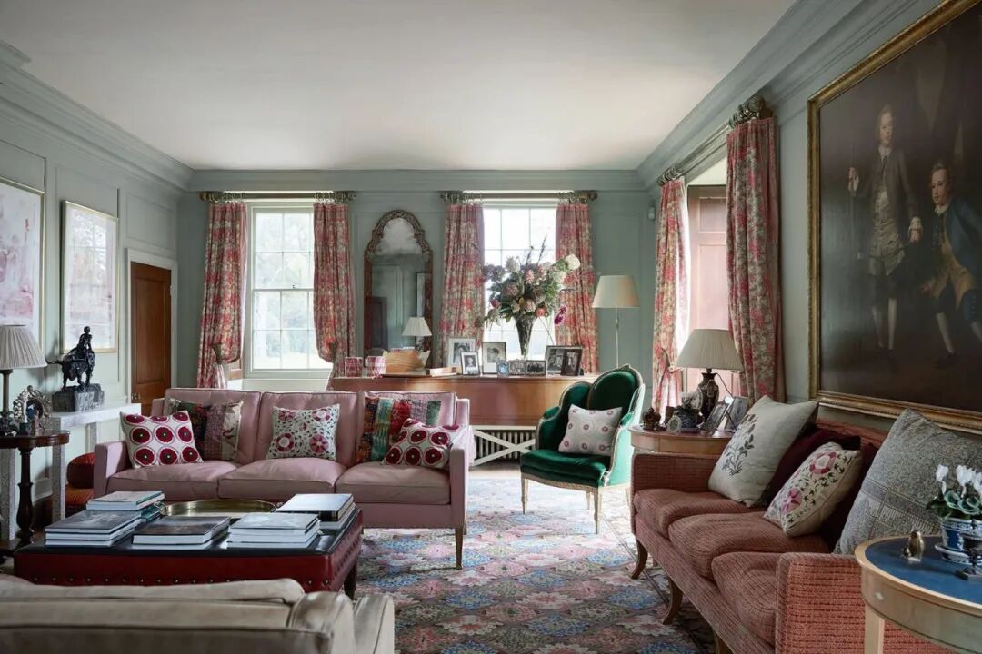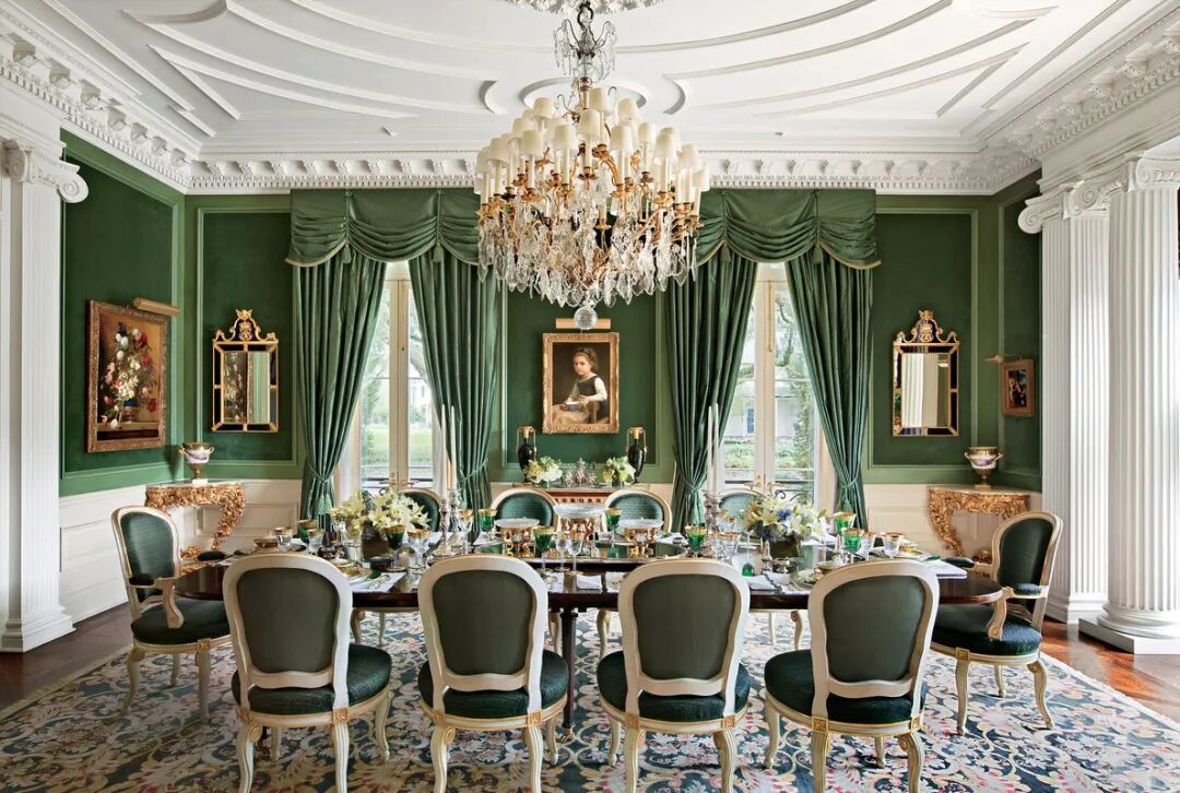 同理,绿与紫的颜色对比加剧环境氛围的戏剧性,在视觉上产生精致高贵的感官冲击,比起绿色调碎花窗帘诠释的森林自然感,带有光泽度的天鹅绒紫色调窗帘更加充满诱惑力。