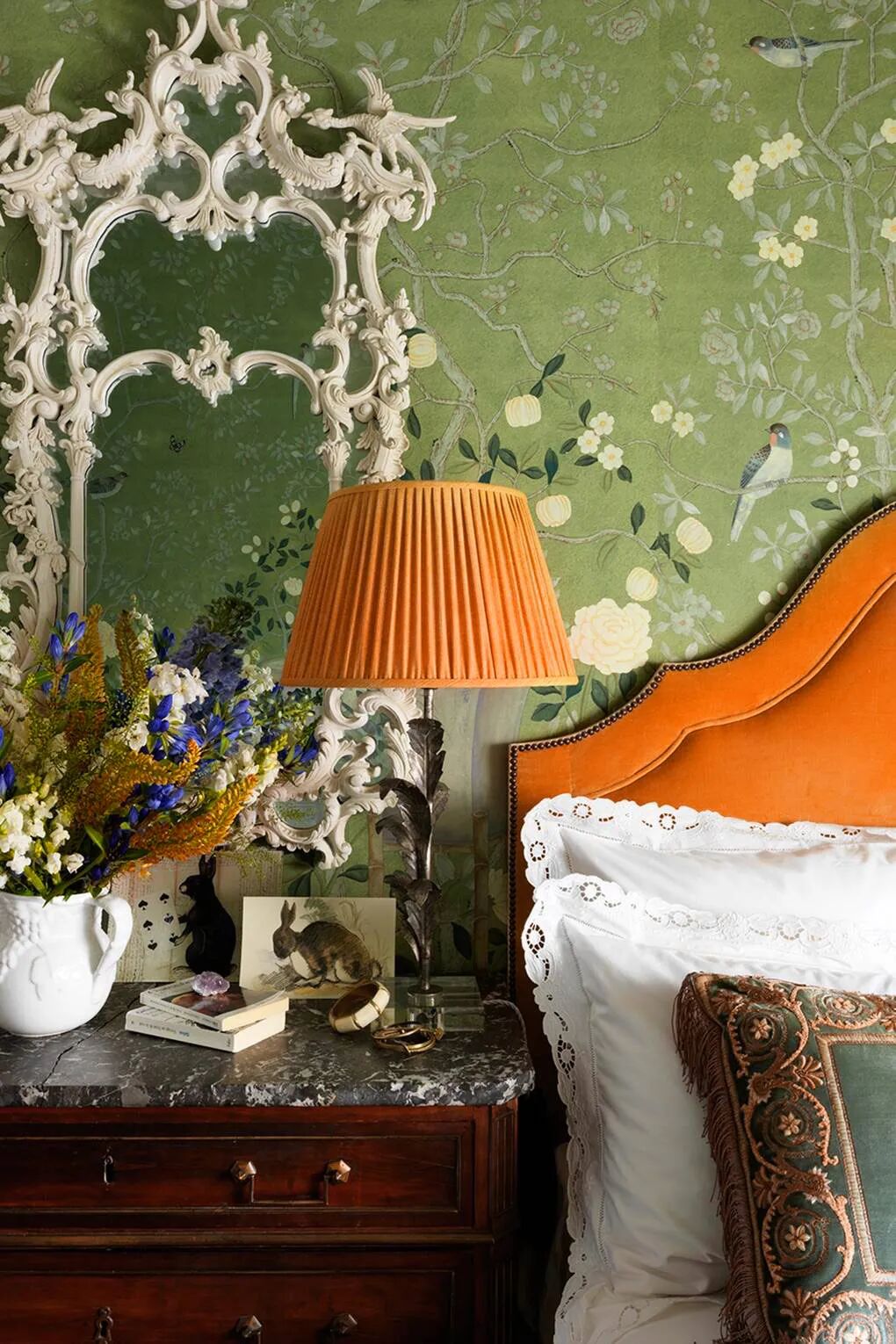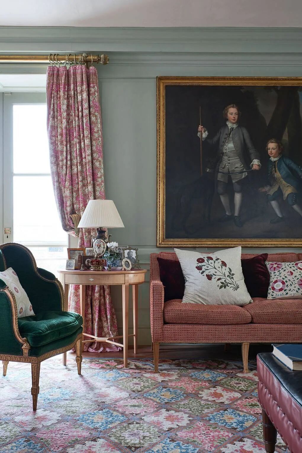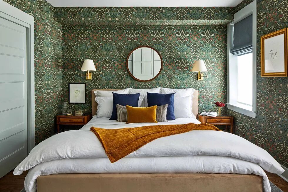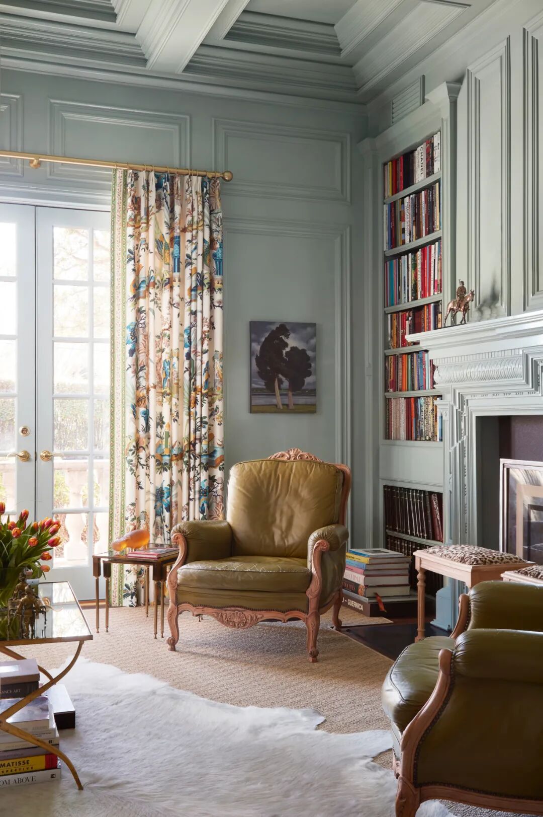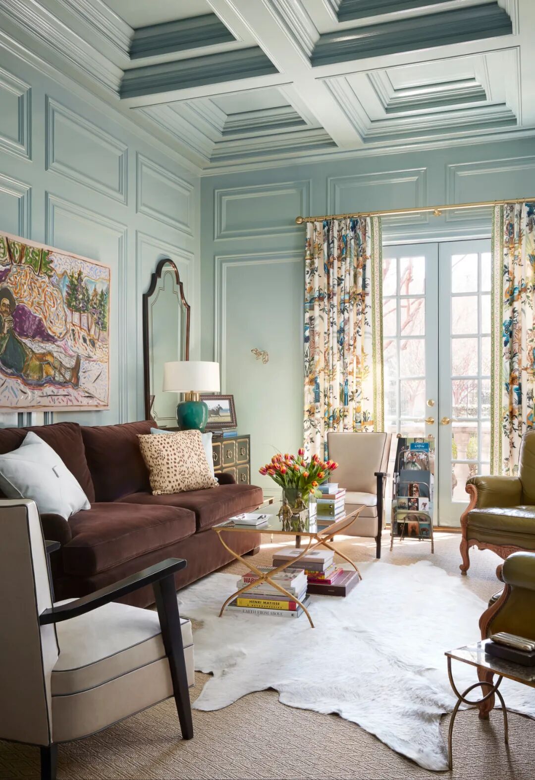 同理,绿与紫的颜色对比加剧环境氛围的戏剧性,在视觉上产生精致高贵的感官冲击,比起绿色调碎花窗帘诠释的森林自然感,带有光泽度的天鹅绒紫色调窗帘更加充满诱惑力。