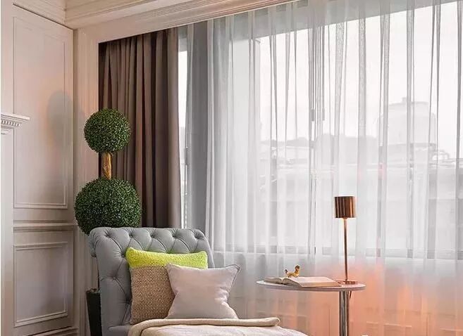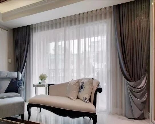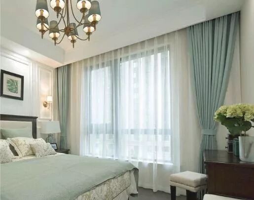 根据灰的程度不一样,风格不一样,搭配也不一样,如果是美式一点的风格,可以配一层灰色+轻纱。看着质感简约很优雅,符合美式的格调。先来看成人卧室的窗帘搭配。