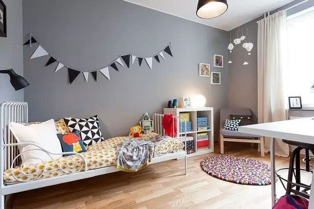 灰色的主色调下,配以明度不高的红绿黄橙,房间不再单调,反而多出几分童趣。