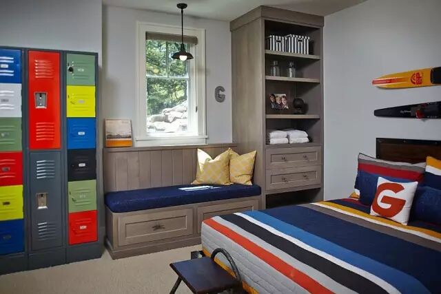 偏灰的基调,墙边的锁柜一股学院风,却又配上多样的色彩,床头的滑雪板体现出青少年的活跃。