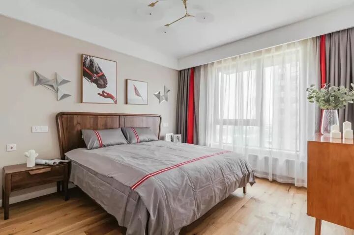 卧室的窗帘更注重功能性,要充分避光以保证睡眠。卧室内窗帘最好选择落地款,以免窗帘过短而漏光。