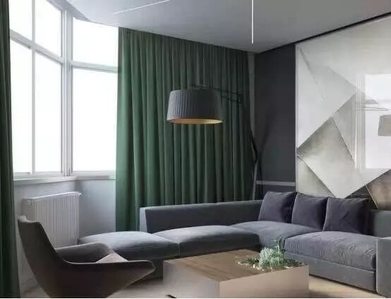 当墙壁是比较苍白的裸灰,家具又是极简风格,那么窗帘不妨选择浓墨重彩的墨绿丝绒,稍许的亮色,让整个房间都鲜活起来!