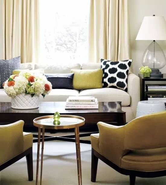 这种选择我们称之为次色调。次色调一般来自那些带显著色彩或者独特图案的中小型物件,比如茶几、地毯、台灯、靠垫或者其他装饰物。如果这些物件提供了两三种不同的次色调,那窗帘的颜色到底应该和谁保持一致,就要看具体情况了。窗帘跟着靠垫颜色走最安全。还有像台灯这样越小件的物品,越适合作为窗帘选色来源,可以避免同一颜色在家里铺得太多。