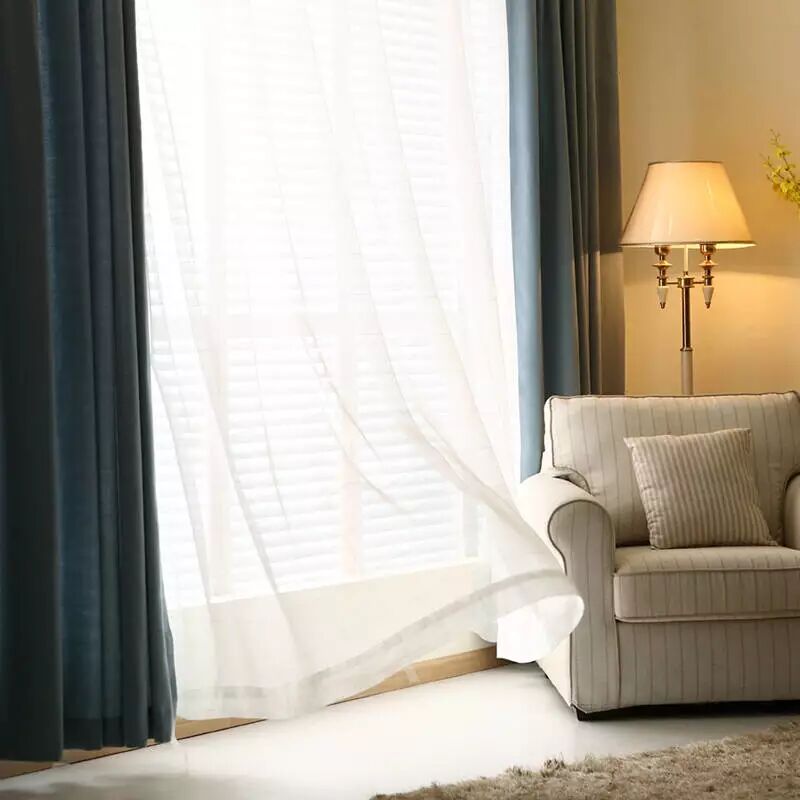 中式风格家装中窗帘的选择可能并不存在中式元素,但一样能够进行搭配。上图中的卧室窗帘搭配主要家具选择了实木材质,主要色调为蓝色与原木色相搭配。空间内床具的蓝色非常醒目,搭配背景墙上的水墨壁纸,别有一番意境,完美地描绘了一个中式风格家装。此处窗帘的选择在造型上没有明显的中式风格,但是颜色与材质与双人床的软靠相搭配,阳台处设计了一个简单的飘窗,放置有青花瓷瓶和几枝盛放的腊梅,别有洞天。