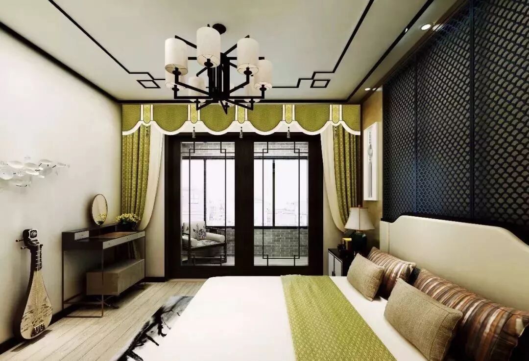 华丽而优雅的中国风纹样幔头衬于黄绿色窗帘之上,黄褐色的主色调延续至床饰之中,稳重简约的新中式梳妆台,精致的中国元素灯具,搭配中式意境的乐器,完美地描绘了新中式风格。