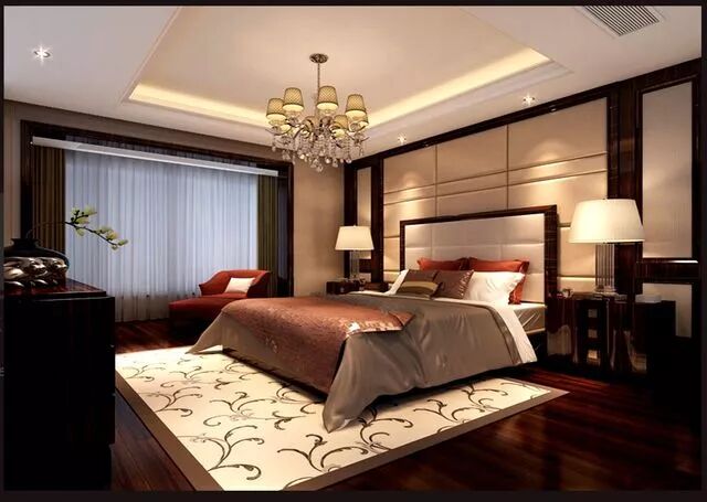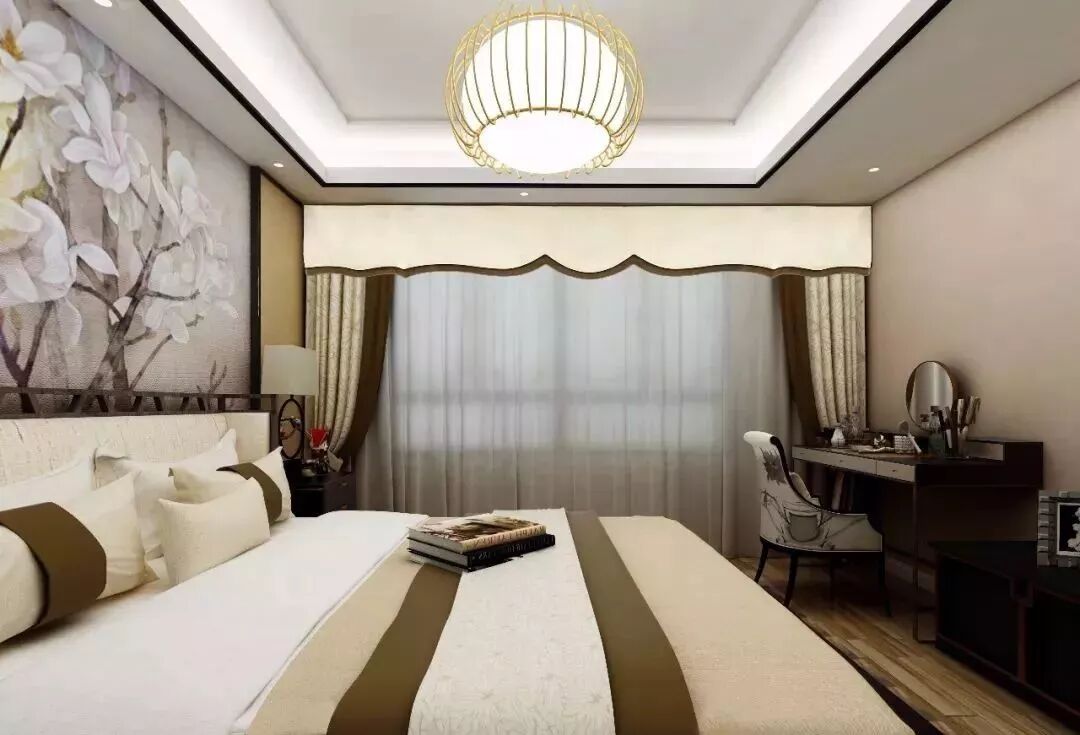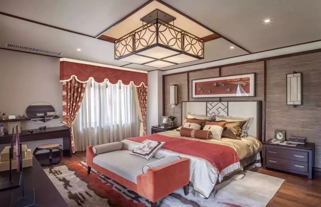 在格调雅致的中式风格空间下,选用橘色系帘头与泛有杉树纹理的主布相接,朴素端庄。搭配造型优雅的床、床头柜、梳妆台,交相辉映。无论是中式灯具还是画中之景,都充满风韵,营造出一种温馨闲适活泼的氛围。