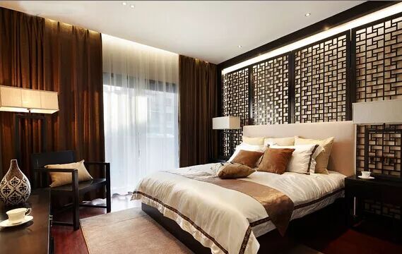 棕色中式图形窗幔垂挂于窗帘之上,与床饰靠包相辅相成,在茶褐色的映衬下,更显得纯净优雅。
