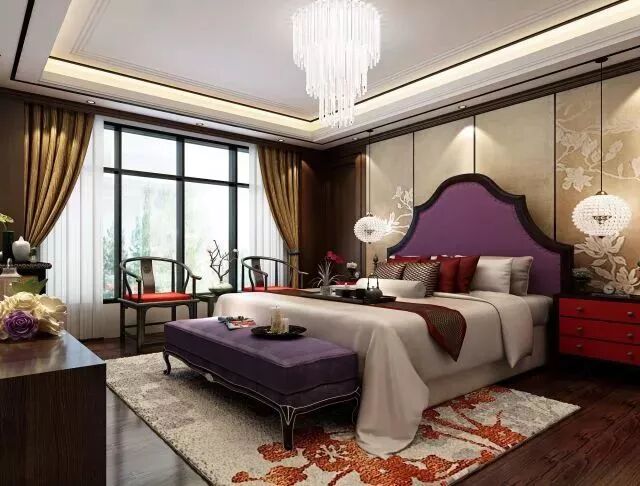 色彩浅淡、材质轻薄的床品和窗帘,都旨在让空间的光线游走自由,这样的布艺设计适合朝向不太理想的空间,床尾深紫色的软榻很好地平衡了房间里深色的线条,避免了过于清淡的用色导致的无焦点感。