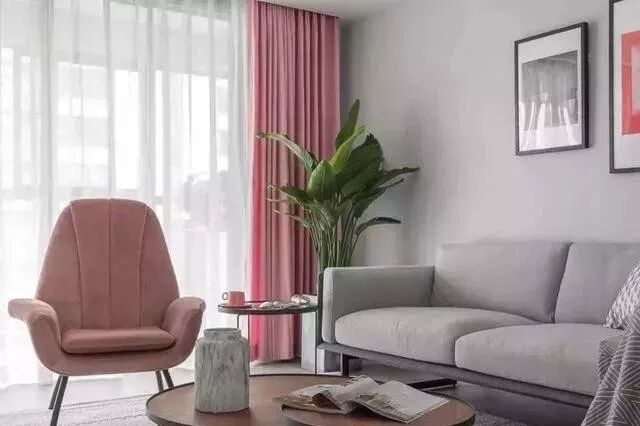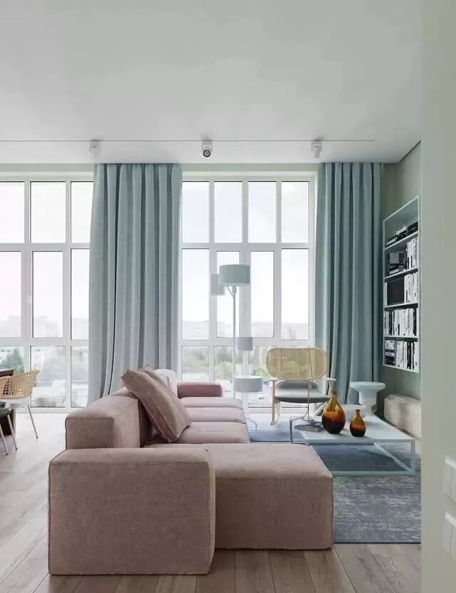 低饱和度的轻波普搭配也很出彩,烟粉色的沙发搭配莫兰迪绿的窗帘,文艺又清新。